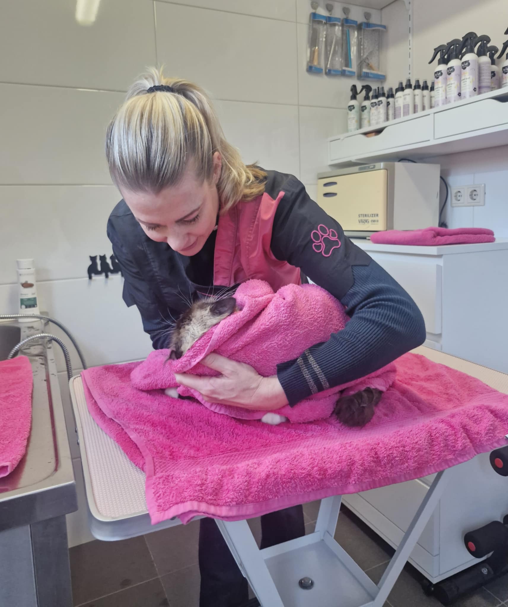 Vervolgens wordt de kat gedroogd en gekamd.